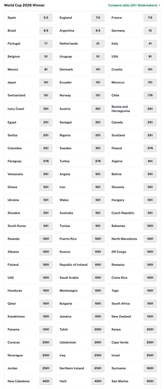2026美加墨世界盃48個席位完成抽籤,分組對陣出來後,博彩公司也第一時間開出了冠軍和金靴等賠率。西班牙最被看好,英法次之,阿根廷和巴西再次之。值得一提的是,此前1970和1986兩次墨西哥世界盃,冠軍恰好就是巴西和阿根廷,而1994美國世界盃冠軍是巴西。