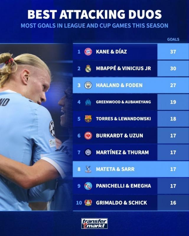 德國轉會市場統計了本賽季五大聯賽進攻端雙人組在聯賽和杯賽中的進球數量,並列出榜單,凱恩+迪亞斯37球居首,姆巴佩+維尼修斯30球次席。
