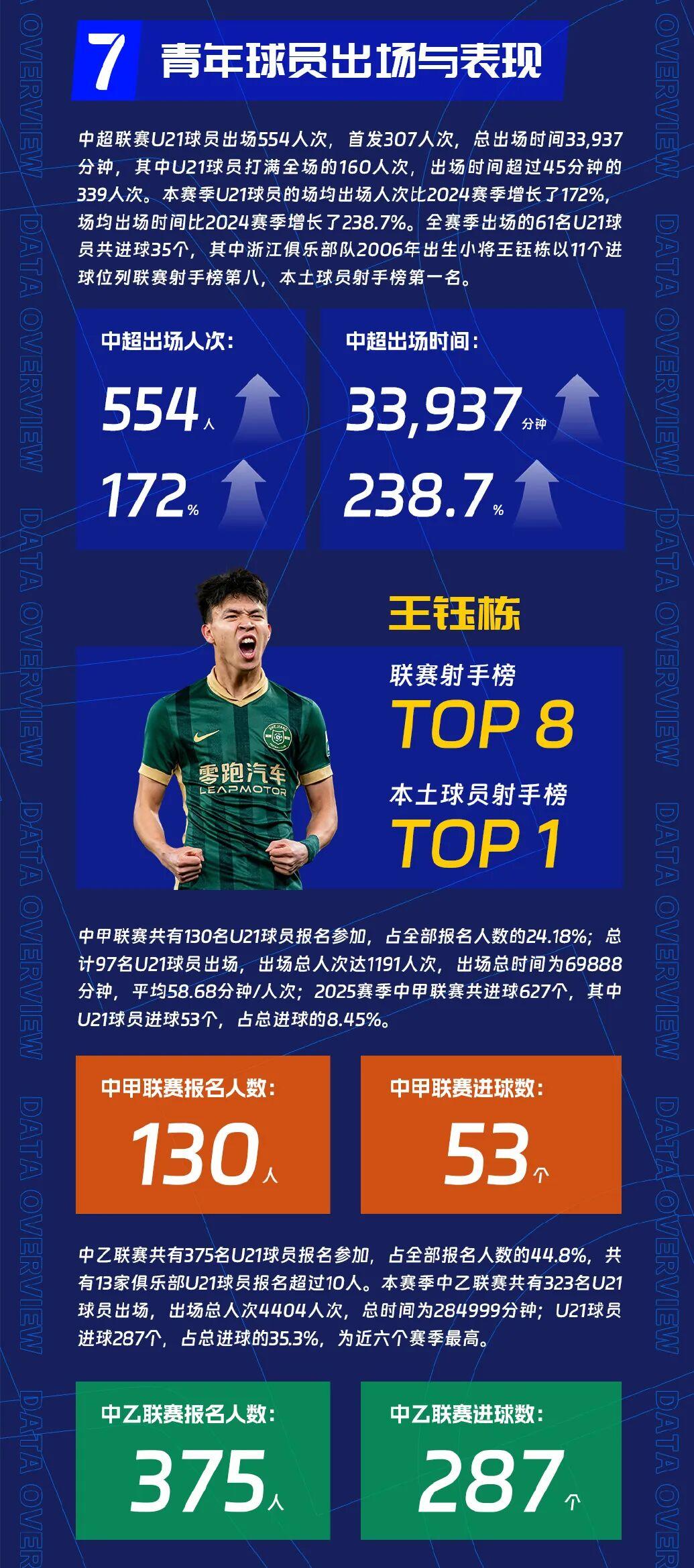 中超U21球員出場554人次,首發307人次,總出場時間33,937分鐘,場均出場人次比2024賽季增長了172%,場均出場時間比2024賽季增長了238.7%,這是一個巨大的增長幅度。