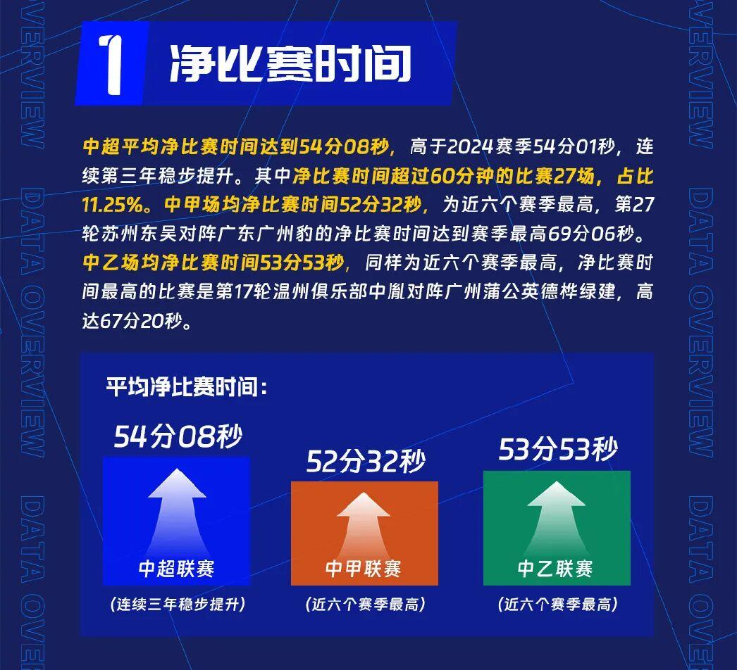 競賽層面,中超平均淨比賽時間達到54分08秒,高於2024賽季54分01秒,連續第三年穩步提升;中甲場均淨比賽時間52分32秒,爲近六個賽季最高;中乙場均淨比賽時間53分53秒,同樣爲近六個賽季最高。