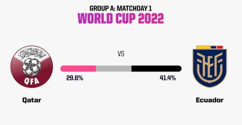卡塔爾世界盃首秀贏球概率不到3成,而厄瓜多爾的取勝概率達到41.4%,平局概率爲29%。