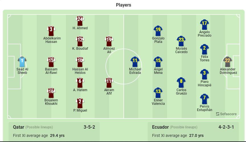 厄瓜多爾(4-2-3-1):多明格斯;埃斯圖皮尼安、因卡皮耶、費利克斯-託雷斯、普雷西亞多;格魯埃索、莫伊塞斯-凱塞多;恩納-瓦倫西亞、梅納、普拉塔;埃斯特拉達