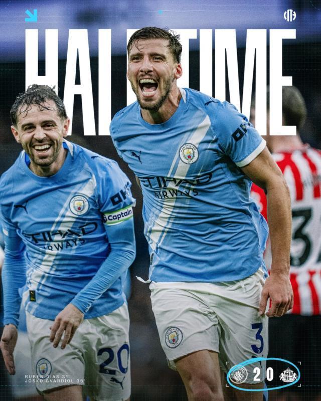 英超聯賽第15輪,曼城主場迎戰表現強勁的升班馬桑德蘭。第31分鐘,魯本·迪亞斯遠射世界波打破僵局。4分鐘後,格瓦迪奧爾在角球中頭球破門。第65分鐘,福登頭球吊射破門擴大比分。