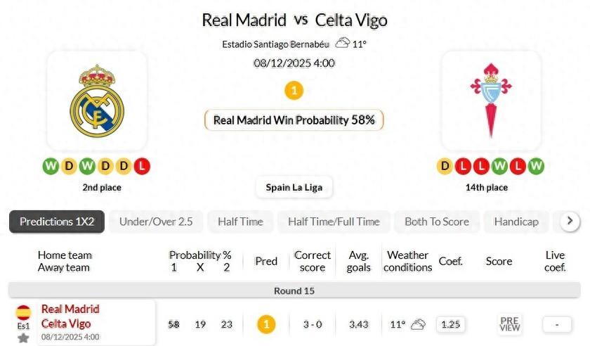 皇家馬德里在最近22次對陣維戈塞爾塔的西甲比賽中保持不敗