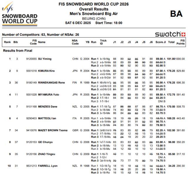 從北京冬奧到米蘭冬奧,蘇翊鳴在單板滑雪領域創下的紀錄已無需一一列舉,這次他在首鋼大跳臺和諸多頂尖選手比拼留下的名場面也稱得上是“神仙打架”——蘇翊鳴不斷改寫的歷史,改變着國際雪聯和國外選手對中國男子單板滑雪的認知;而蘇翊鳴取得的突破,也在激勵着更多中國年輕選手加入到單板滑雪項目上來,這次大跳臺世界盃北京站男子單板有6名中國選手集體亮相;蘇翊鳴不斷挑戰高難度,也和更多選手在一起推動着單板滑雪大跳臺的蓬勃發展,就像現在的選手,如果沒有拿手的1980難度動作,很難衝擊金牌。