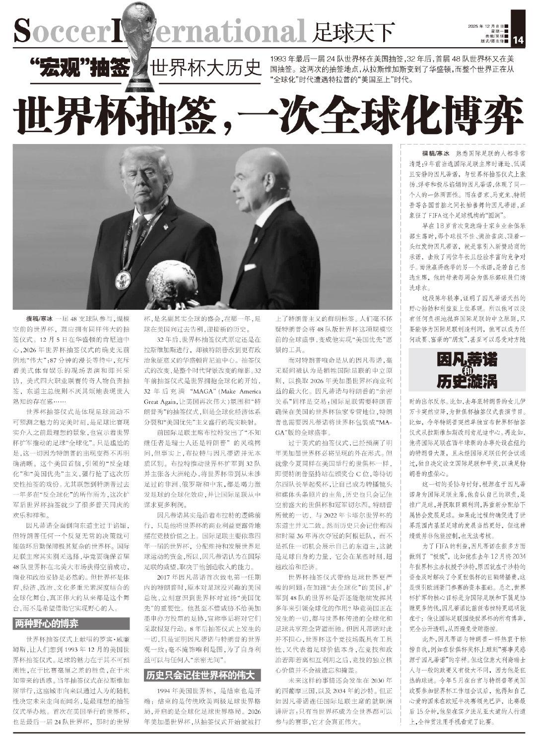 過於美式的抽籤儀式,已經預演了明年美加墨世界盃必將呈現的外在形式。但就像今夏同樣在美國舉行的世俱杯一樣,即便特朗普堅持站在頒獎臺C位,等待切爾西隊長舉起獎盃,讓自己成爲轉播鏡頭和媒體頭條照片的主角,歷史也只會記住空前盛大的世俱杯和冠軍切爾西。特朗普所做的一切,與2022年卡塔爾世界盃的東道主並無二致。然而歷史只會記住梅西和時隔36年再次奪冠的阿根廷隊,而不是抓住一切機會展示自己的東道主,這就是足球自身的力量,它會在某些時刻,超越政治和經濟。