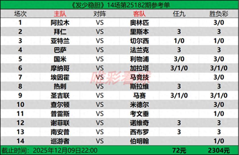 【發少穩膽25182期勝負彩14場(2304元)任九(72元)推薦方案】