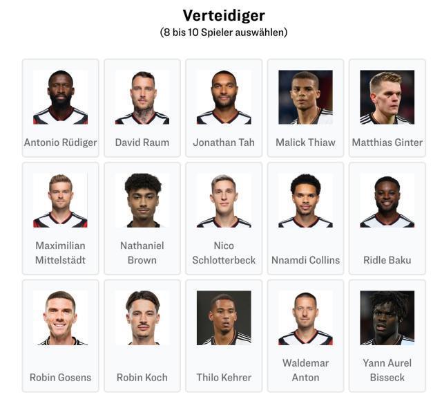 尼科·施洛特貝克和若納唐·塔此前聯袂表現不錯,拿到了97%的支持率。比較有爭議的是呂迪格,他得到了71%的支持率,雖然論資歷和經驗,他應當是德國隊防線核心,但皇馬中衛從來沒有在國家隊兌現過外界對於他的期待,反而更多的是拙劣發揮和不妥當行爲。在他缺陣的兩個國家隊比賽日週期,施洛特貝克和塔已經組成穩定搭檔,納格爾斯曼如何對待呂迪格,在明年有很大的看點。勤勤懇懇的安東拿到70%支持率,本賽季轉會紐卡斯爾後表現不錯的馬利克·佳夫,是得票第5高的中後衛。本賽季表現糟糕的科赫、許久沒有入選國家隊的金特爾等人,都是陪跑角色。
