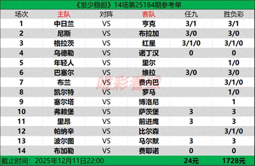 【發少穩膽25184期勝負彩14場(1728元)任九(24元)推薦方案】