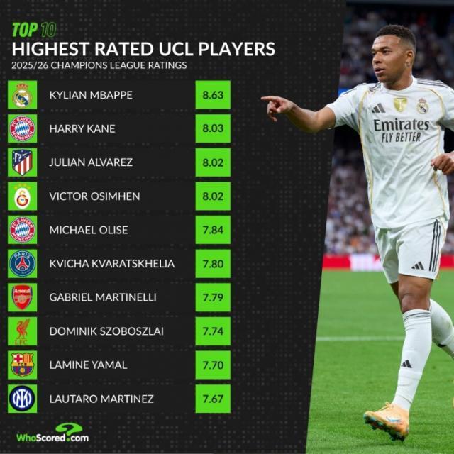 WhoScored統計了本賽季球員在歐冠比賽中的場均評分,並列出評分最高榜單,姆巴佩8.63分居首,凱恩8.03分次席。