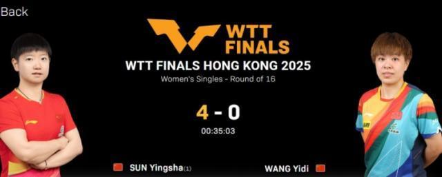 2025WTT中國香港總決賽女單1/8決賽,孫穎莎戰勝王藝迪,晉級8強。本場比賽中,孫穎莎4比0戰勝王藝迪,比分爲:11比3,11比9,11比7,11比7。下一輪孫穎莎將對陣長崎美柚。