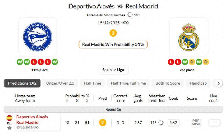 皇馬近3次各項賽事對陣阿拉維斯,均實現半場、全場雙勝