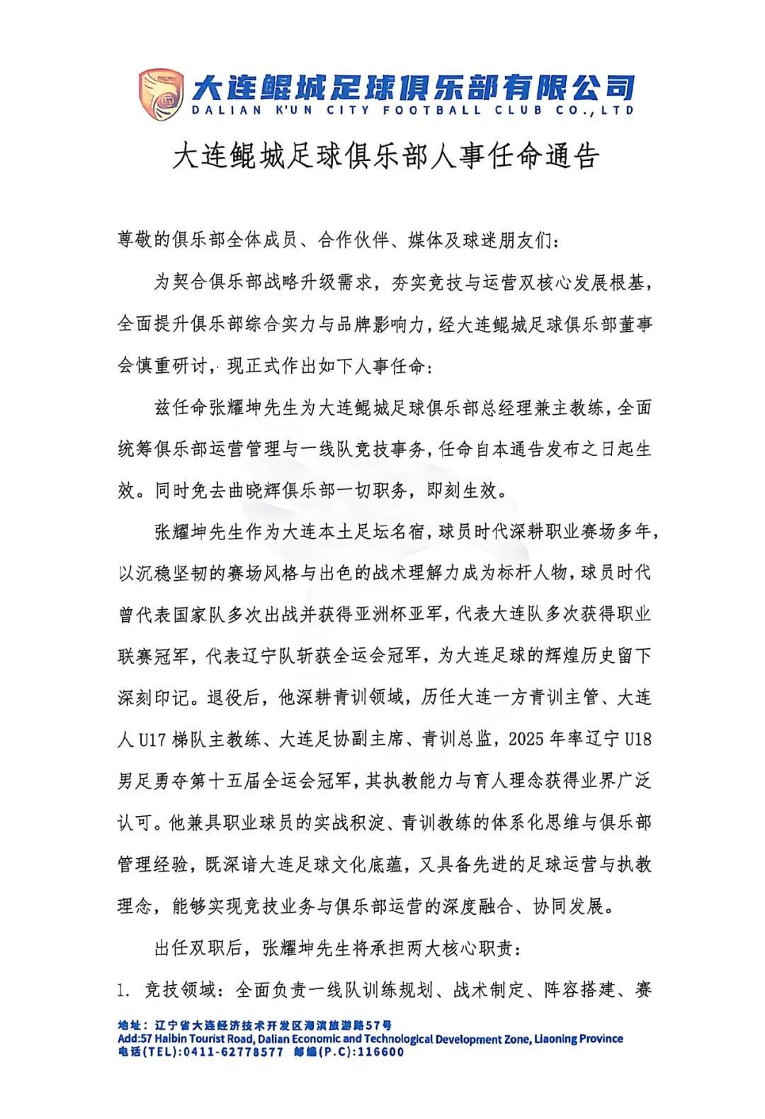 今天上午,大連鯤城官方宣佈:“茲任命張耀坤先生爲大連鯤城足球俱樂部總經理兼主教練,全面統籌俱樂部運營管理與一線隊競技事務,任命自本通告發布之日起生效。同時免去曲曉輝(原總經理)俱樂部一切職務,即刻生效。”