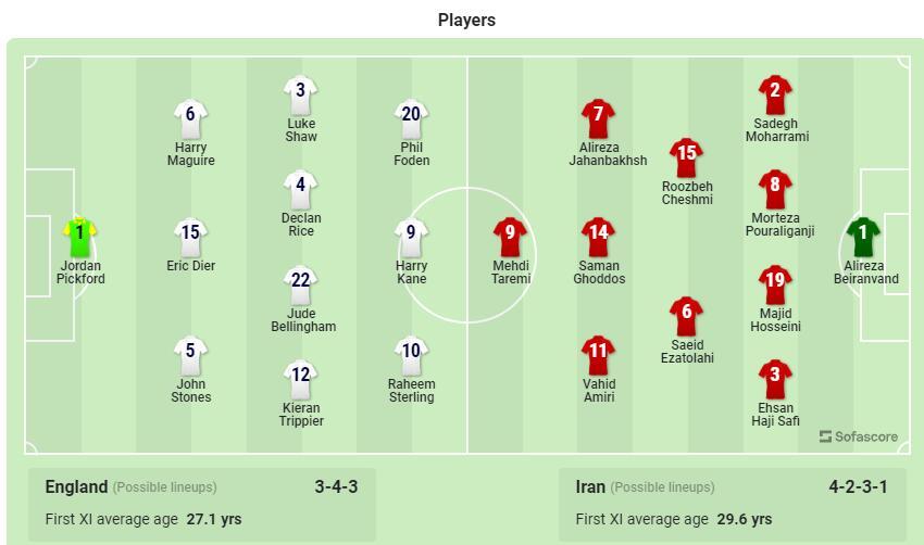 注:英格蘭的凱爾-沃克、麥迪遜和菲利普斯將因傷缺席,而伊朗這邊只有阿茲蒙上不了。