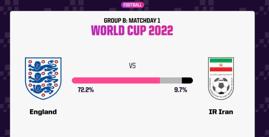 英格蘭首輪取得開門紅的概率達到72.2%,而伊朗爆冷取勝的可能性不到1成。