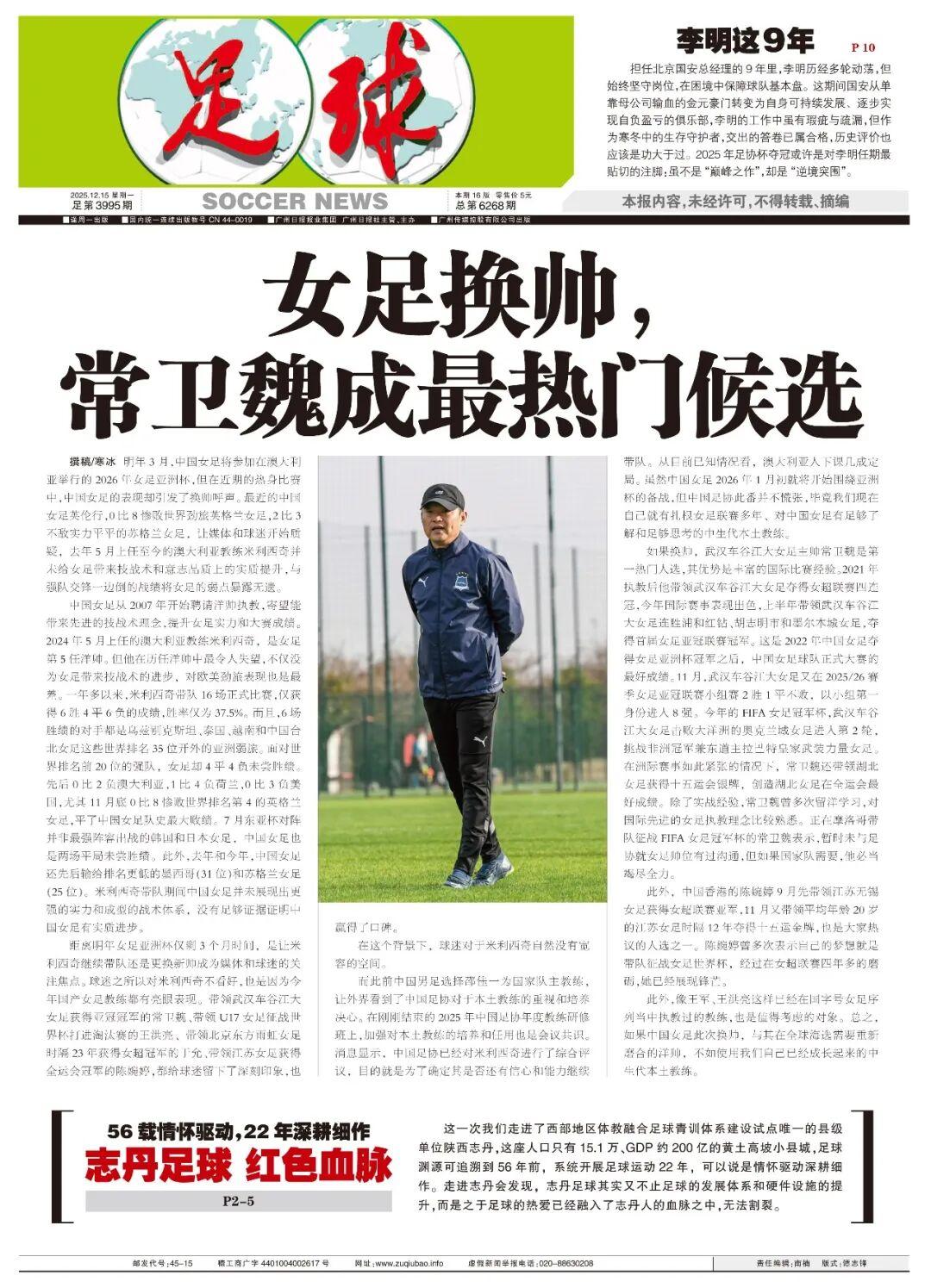 在洲際賽事如此緊張的情況下,常衛魏還帶領湖北女足獲得十五運會銀牌,創造湖北女足在全運會最好成績。除了實戰經驗,常衛魏曾多次留洋學習,對國際先進的女足執教理念比較熟悉。常衛魏對本報表示,暫時未與足協就女足帥位有過溝通,但如果國家隊需要,他必當竭盡全力。