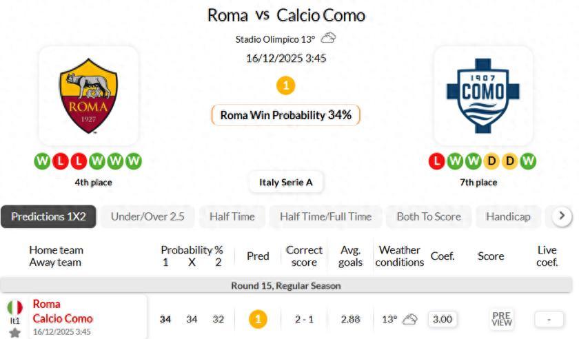 -In past encounters between the teams in the league, Roma has emerged victorious twice in their 4 head-to-head battles against Calcio Como.