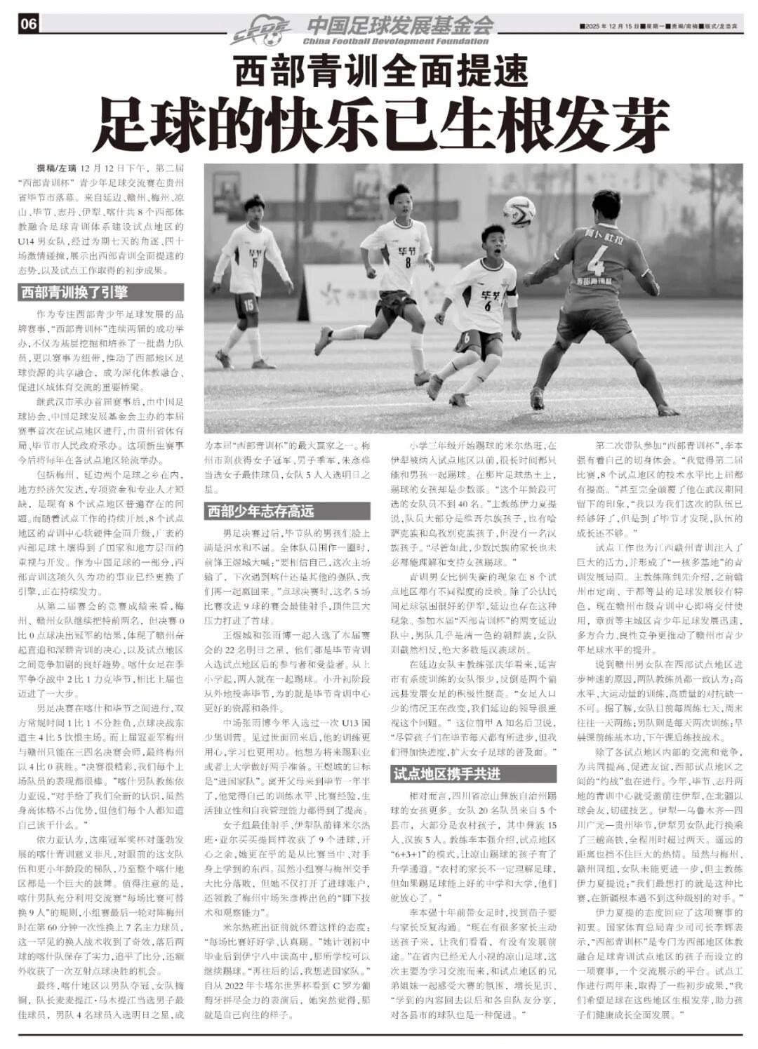 作爲專注西部青少年足球發展的品牌賽事,“西部青訓杯”連續兩屆的成功舉辦,不僅爲基層挖掘和培養了一批潛力隊員,更以賽事爲紐帶,推動了西部地區足球資源的共享融合,成爲深化體教融合、促進區域體育交流的重要橋樑。