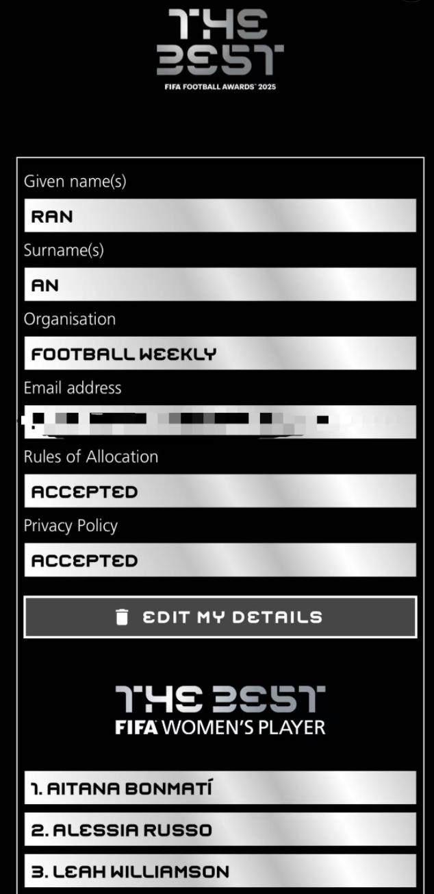 2025年度國際足聯頒獎,女足三大獎項中,邦馬蒂(西班牙/巴塞羅那)實現世界足球小姐三連莊,漢普頓(英格蘭/切爾西)首度當選世界最佳女足門將,名帥魏格曼(荷蘭/英格蘭隊)則在FIFA評獎中第5次榮膺世界最佳女足教練。
