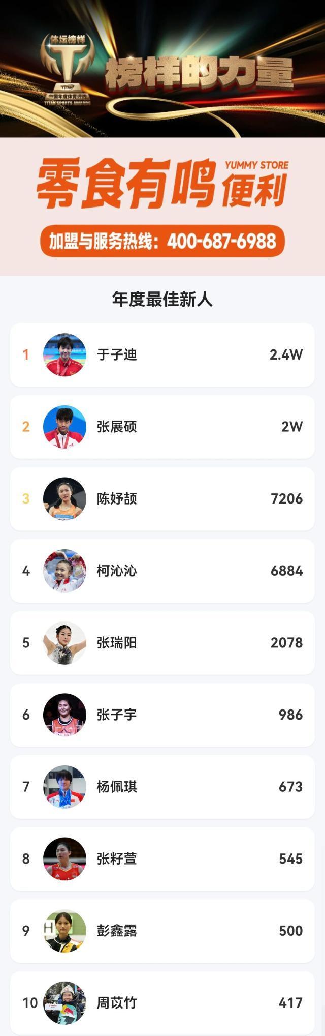 大衆評選年度最佳新人方面,於子迪、張展碩、陳妤頡三位年輕選手分獲前三,他們的脫穎而出預示着中國體育新生代的蓬勃朝氣與無限潛力。