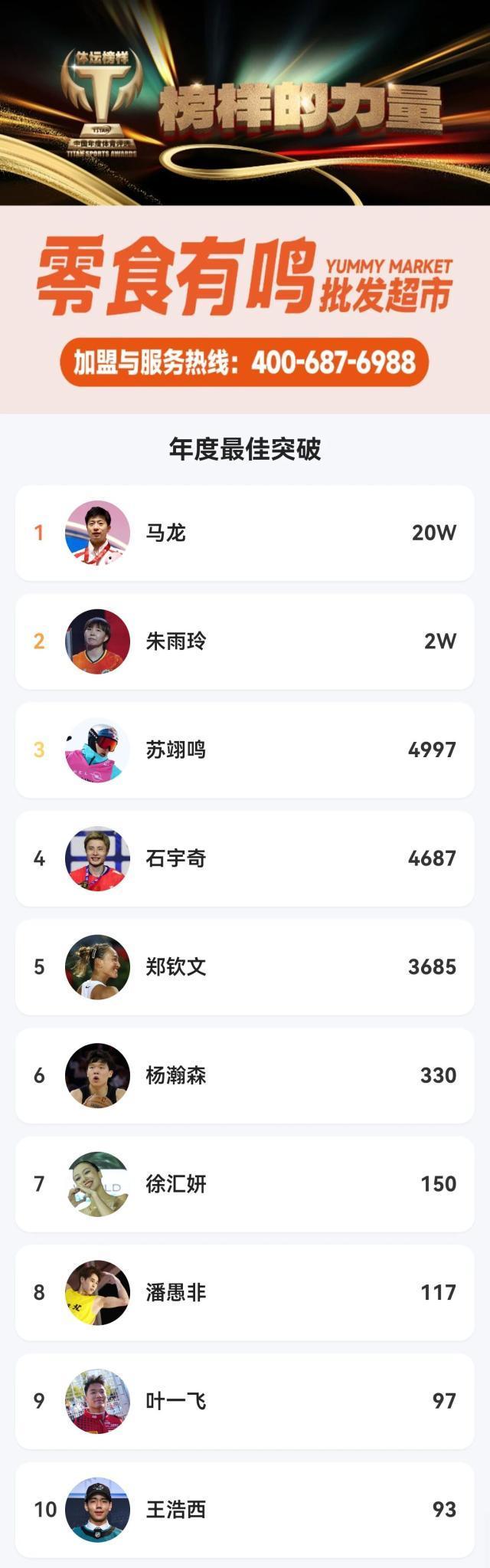 大衆評選年度最佳突破評選中,老將馬龍以20萬票強勢登頂,彰顯其跨越年齡、持續突破的體育精神;朱雨玲、蘇翊鳴分列二、三位,也各有令人動容的進取故事。