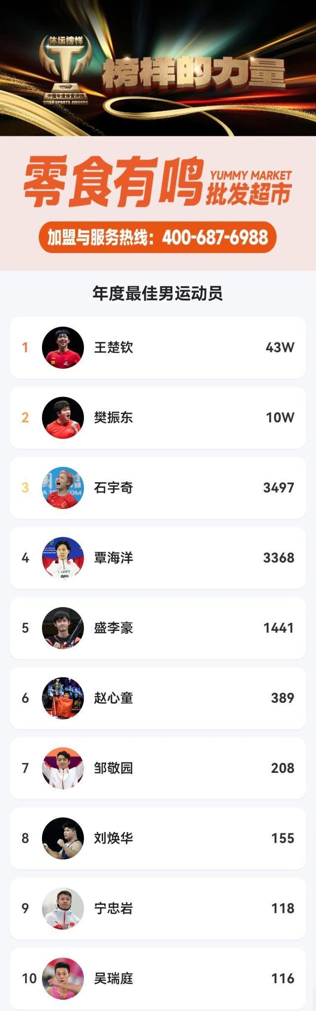 在男子最佳運動員大衆評選中,國乒新生代領軍人物王楚欽,以43萬票的絕對優勢榮登榜首;同樣來自乒乓球隊的樊振東以10萬票位居第二;羽毛球名將石宇奇以3,497票躋身第三,展現了不同項目運動員在公衆心中同樣佔據重要位置。