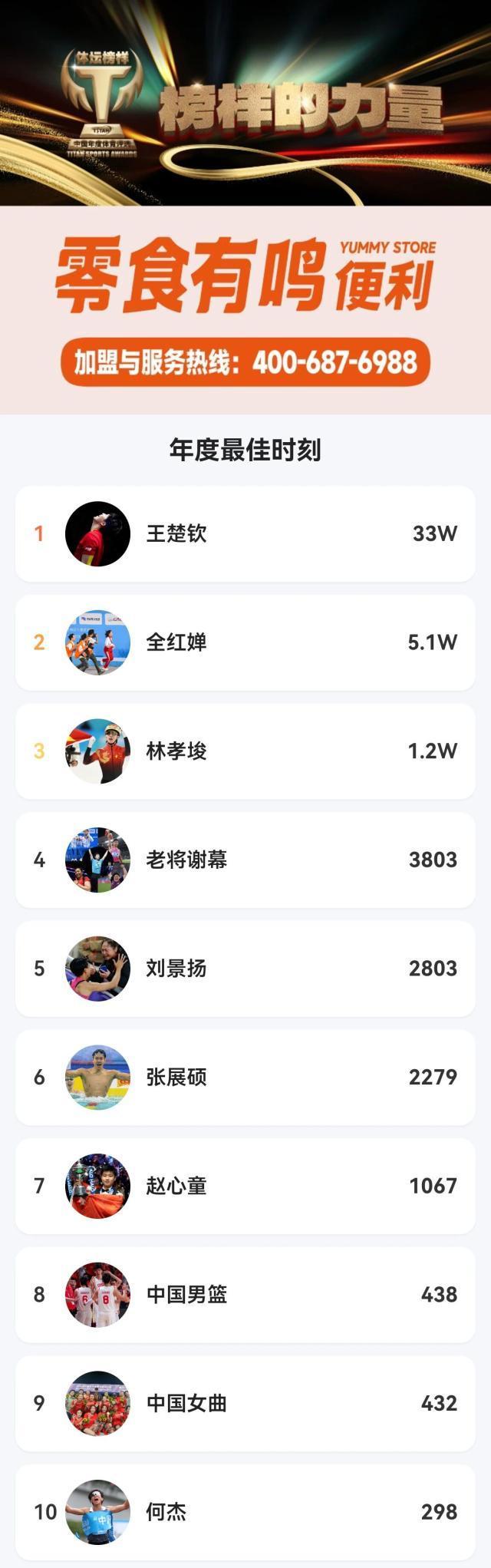 大衆評選年度最佳時刻獎項,王楚欽以33萬票奪魁,全紅嬋、林孝埈緊隨其後,這些“高光瞬間”凝結了運動員奮鬥的汗水與夢想的閃光,也成爲體育精神傳播的生動載體。