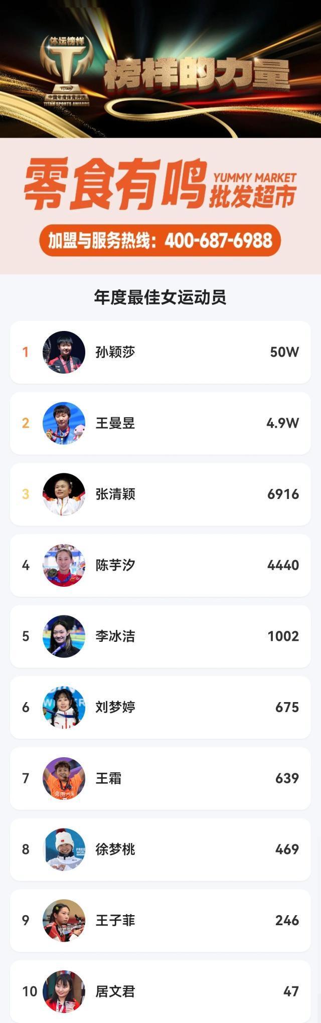 女子最佳運動員的大衆評選中,乒乓球運動員孫穎莎以50萬票高票奪冠,其人氣與實力得到雙重印證;隊友王曼昱以4.9萬票位列第二,展現出國乒女隊強大的集體影響力;體操運動員張清穎以6,916票進入前三。