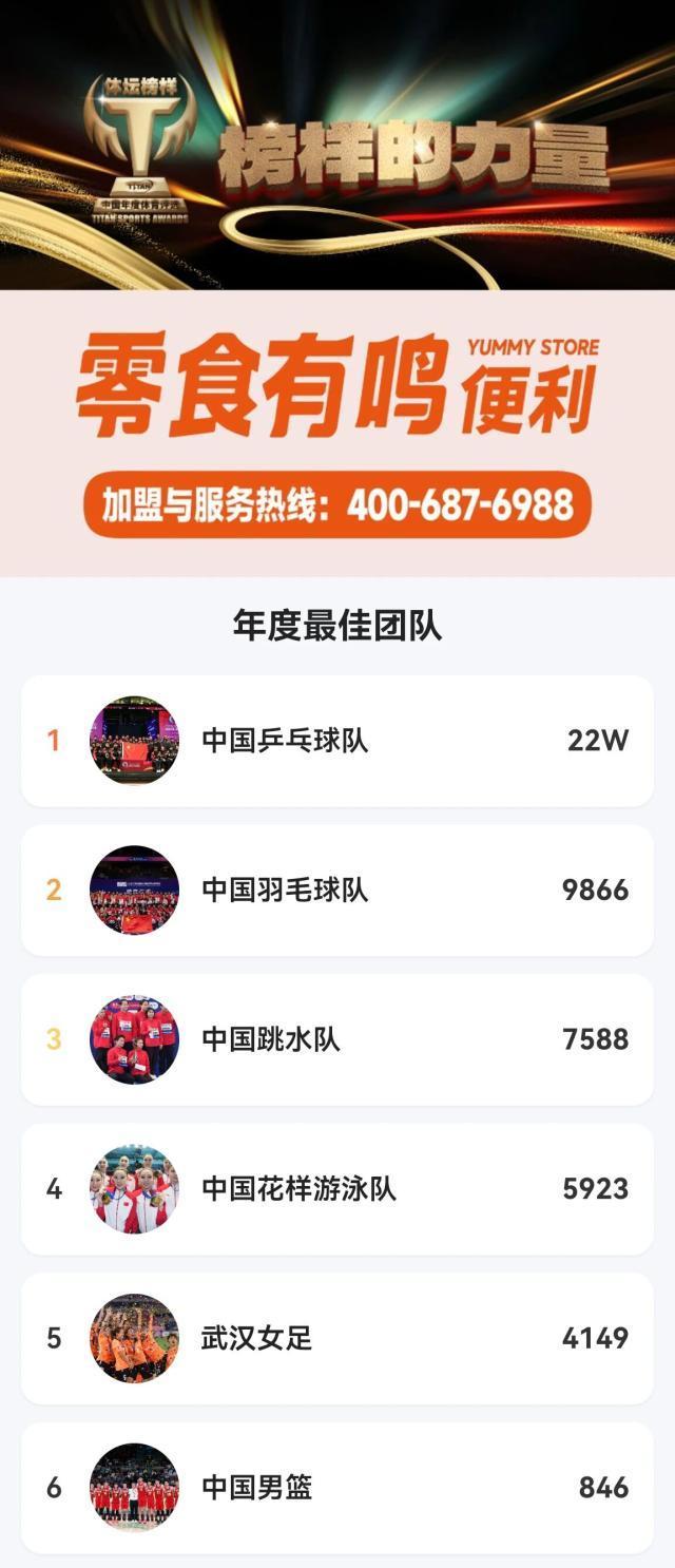 大衆評選年度最佳團隊評選結果凸顯了“國球”的深厚根基——中國乒乓球隊以22萬票遙遙領先,中國羽毛球隊以9,866票位居次席,中國跳水隊以7,588票名列第三。這三支隊伍不僅在國際賽場上屢創佳績,更在公衆心中樹立起頑強拼搏、團結協作的團隊形象。