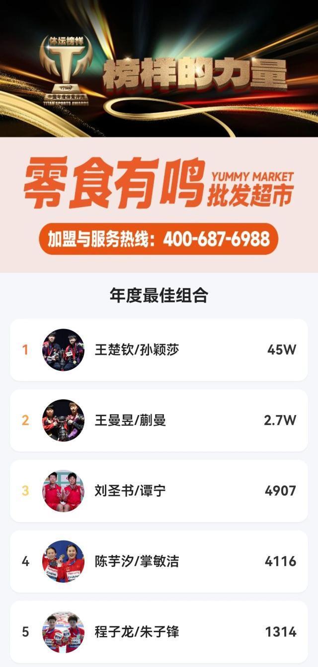 大衆評選年度最佳組合獎項毫無懸念地由混雙黃金搭檔王楚欽/孫穎莎摘得,兩人以45萬票彰顯出“莎頭組合”在觀衆心中的超強號召力;王曼昱/蒯曼以2.7萬票位列第二;羽毛球女雙組合劉聖書/譚寧以4,907票獲得第三,展現了不同項目雙打組合的獨特魅力。