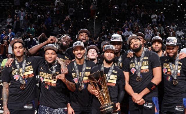 杰倫·布朗森舉起了第三屆NBA盃賽MVP獎盃,他在決賽中轟下25分4籃板8助攻2蓋帽,正負值爲全場最高的+15。這位2018年的二輪秀,在12月17日的NBA杯決賽,率領尼克斯以124比113擊敗馬刺奪冠。