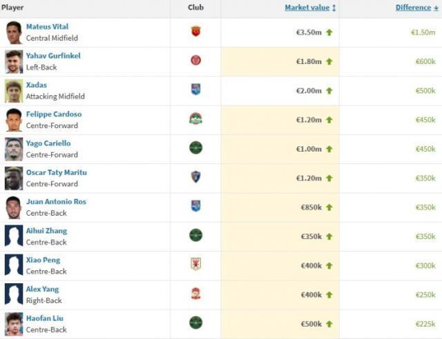 球員方面,海港外援維塔爾上漲150萬歐元,成爲了本期身價漲幅最高的中超球員。