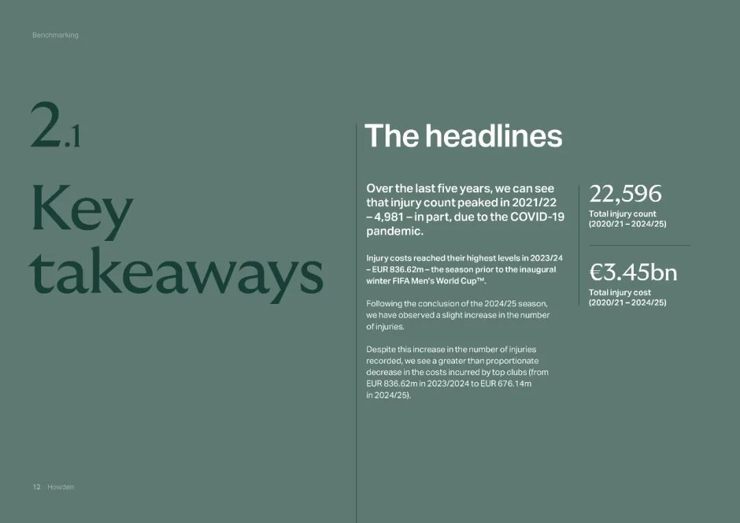 2020年疫情暴發,導致聯賽後程被推遲到夏季高密度進行。隨後連續經歷了2021年歐洲盃,2022年世界盃,2024年歐洲盃和2025年世俱杯。賽程緊密使得大賽後的傷病激增,2022年卡塔爾世界盃中斷了歐洲傳統賽季,幾乎沒有增加冬休時間,直接造成傷病人次和成本的上升。2022年12月五大聯賽的“傷病成本”爲5032萬歐元,2023年1月世界盃結束後僅1個月就飆升到7819萬,增幅高達55%。