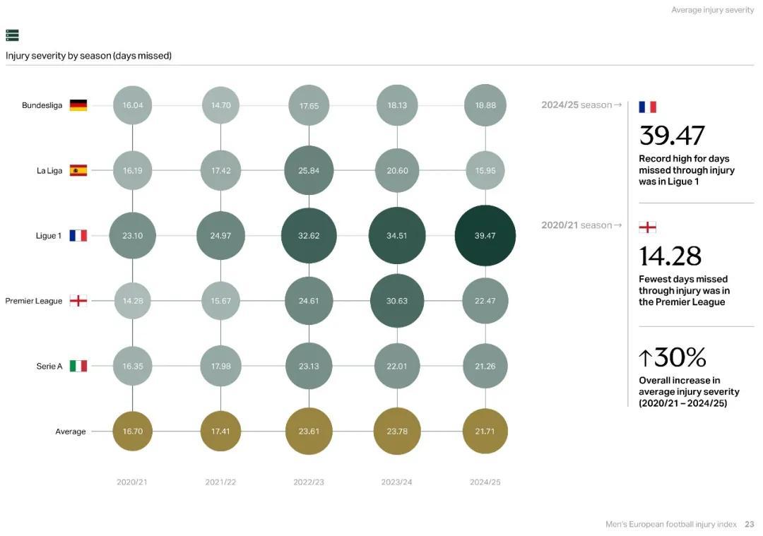 豪頓報告顯示過去的5個賽季,五大聯賽單賽季平均傷病時間普遍增長。法甲從23.1天飆升到39.47天,形勢最嚴峻。英超從14.28天增至22.47天,2023/24賽季峯值也達到30.63天。究其根源,近5個賽季愈發緊密的賽程和不斷增加的比賽是主因。曾與曼聯和紅牛集團合作過的精英運動員傷病風險專家索普表示:“大賽後的傷病激增符合邏輯,參加國際大賽的球員都是高薪精英球員,他們的傷病會造成俱樂部成績和經濟的巨大損失。”