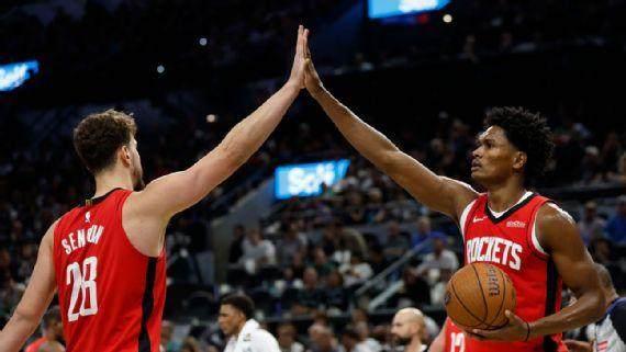 根據ESPN的數據,這對年輕的二人組(分別爲22歲和23歲)本賽季共同出場的時間是火箭隊所有組合中最多的。他們也已經建立起了一種日益增長的化學反應,有望在未來多年席捲聯盟。湯普森和申京本賽季場均合砍40.8分,而上賽季(2024-25賽季)是33.2分。當湯普森和申京同時在場時,火箭隊場均淨勝對手6.0分,比上賽季提高了2.2分。