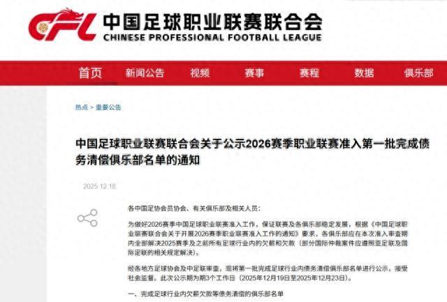 爲做好2026賽季中國足球職業聯賽准入工作,保證聯賽及各俱樂部穩定發展,根據《中國足球職業聯賽聯合會關於開展2026賽季職業聯賽准入工作的通知》要求,各俱樂部應在本次准入審查期內全部解決2025賽季及之前所有足球行業內的欠薪和欠款(部分國際仲裁案件應遵照亞足聯及國際足聯的相關規定解決)。