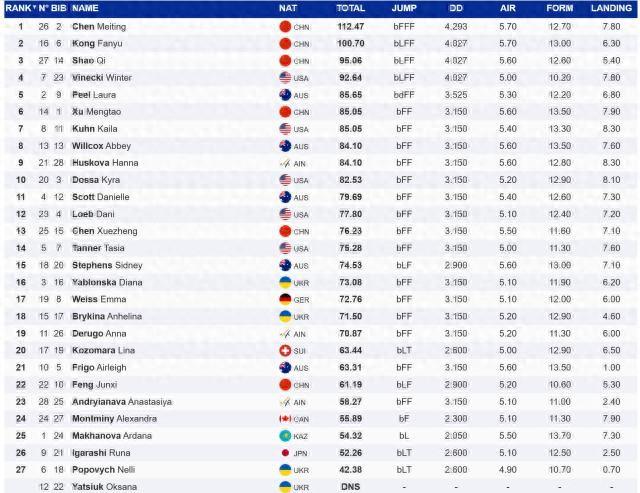 資格賽中,中國選手陳梅婷表現出色,拿到全場最高分112.47分,獲得資格賽第一,孔凡鈺則以100.70分排名資格賽第二,邵琪則得到95.06分,緊隨其後,中國選手包攬了資格賽前三名。奧運冠軍徐夢桃得到85.05分,排名第6位,也順利晉級。