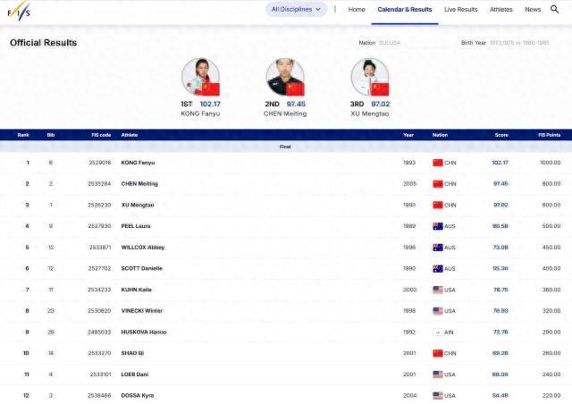 體壇週報全媒體發佈北京時間12月20日,2025年自由式滑雪空中技巧世界盃雲頂站結束了空中技巧單項決賽。女子組四名中國選手晉級決賽,最終孔凡鈺、陳梅婷和徐夢桃三人包攬了前三名。孔凡鈺在決賽中表現出色,拿到了102.17分的高分,獲得冠軍,她也是決賽中唯一得分超過100分的選手。以資格賽第一晉級的陳梅婷拿到97.45分,獲得亞軍。奧運冠軍徐夢桃則以97.02分拿到銅牌。另外一位00後選手邵琪雖然在資格賽表現不俗,以第三名晉級決賽,但是決賽發揮欠佳,只拿到69.28分,最終排名第10位。