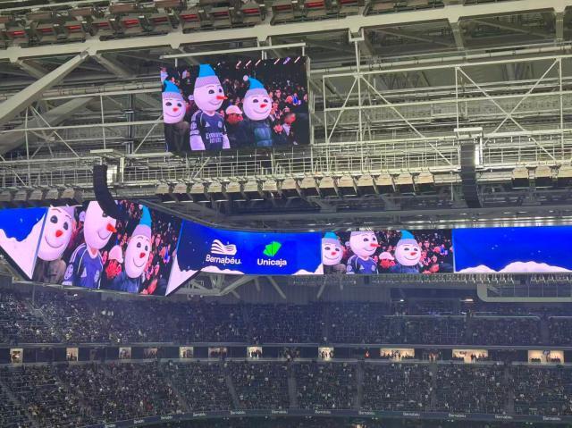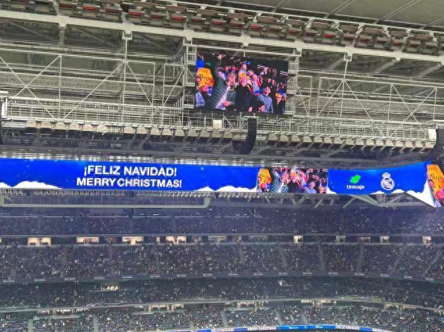 聖誕節將至,馬德里市中心擠滿了出門採購的本地居民和外來遊客,伯納烏球場也迎來皇馬戰塞維利亞的2025年收官之戰。之前的連續兩個主場比賽,皇馬先是在聯賽中連喫兩紅牌被塞爾塔掀翻,隨後又在場面不算差的情況下輸給曼城,用主場勝利爲2025收官,不僅是保住阿隆索帥位的根本,也是對幾乎坐滿全場的皇馬球迷的最好回饋。和馬德里街頭琳琅滿目的聖誕彩燈一樣,伯納烏在聖誕前最後一戰的賽前儀式中也將節日氛圍拉滿,現場屏幕給到的球迷鏡頭中,都被加上了聖誕帽和聖誕老人裝束的AI特效,現場DJ也爲所有來現場觀賽的球迷送出了祝福,並循環播放起聖誕主題歌曲,伴隨着讓人目不暇接的現場燈光秀和首發陣容報送。