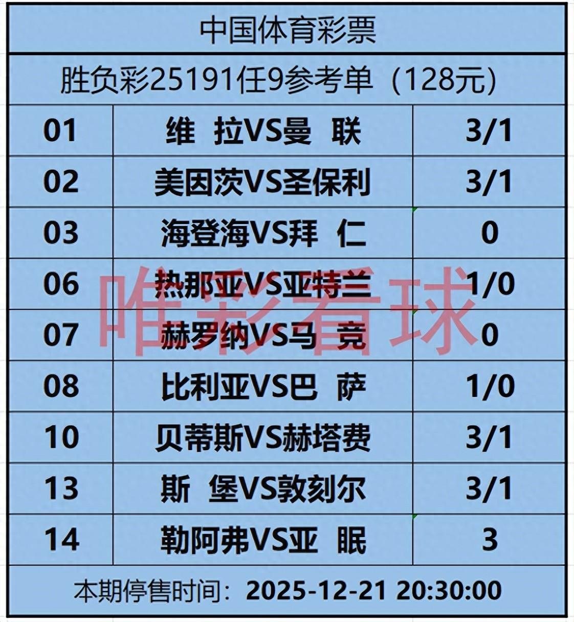 姜山:維拉最近的走勢確實相當兇猛,近11輪聯賽10勝1負,僅在客場不敵利物浦,但這期間主場力克曼城、客場擊敗熱刺都是含金量很高的場次。而在歐聯杯上,他們近3輪同樣取得全勝,球隊兩線開花齊頭並進——聯賽高居第3位且只落後榜首的阿森納3分,完全有爭冠的希望;而歐聯杯維拉5勝1負,與里昂、中日德蘭同分領跑積分榜。本輪如果能在主場拿下曼聯,維拉將給球迷們送上一份最好的聖誕禮物。而且,非洲杯並未造成維拉減員,他們目前只有長期傷缺的主力中衛明斯這一位重要傷兵。而上輪聯賽因傷缺席的另一名主力中衛保·託雷斯已經傷愈復出,本輪大概率首發與孔薩重組中衛線。雖然維拉本賽季始終缺乏一名高效射手,但羅傑斯、布恩迪亞、馬倫、沃特金斯等人組成的攻擊羣重在攻擊點位衆多,後腰卡馬拉、左後衛迪涅、右後衛卡什、中場麥克金也有很強的助攻或進球能力,所以維拉並未缺乏破門的手段。曼聯其實近況也不差,近10輪聯賽5勝4平1負,只在主場爆冷不敵埃弗頓。不過他們近期防守出現一定的問題,近8輪聯賽丟球14個,上輪在主場被持續不勝的伯恩茅斯4比4逼平。更糟糕的是,主力右翼衛迪亞洛、輪換右翼衛馬茲拉維、主力前腰姆貝莫都將離隊參加非洲杯,從而缺席本輪聯賽。主力中衛德利赫特和輪換中衛馬奎爾繼續傷缺,主力後腰卡塞米羅本輪停賽。可以說,本場曼聯遭遇人員重創,不得不用20歲的約羅、19歲的海文與盧克·肖搭檔三中衛,本賽季只打過一次主力的梅努也將作爲後腰首發,中後場不確定因素很多。所以本輪,我還是更看好陣容整齊且近況上佳的維拉的取勝前景,個人傾向於博取單3。當然,如果彩民朋友出於謹慎的話走3/1路線也沒有問題,但缺兵少將的曼聯很難在本輪打出客勝的結果。