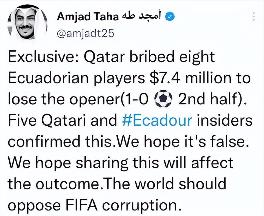 其實他們還真沒說錯,就在東道主卡塔爾對陣厄瓜多爾的揭幕戰之前,有國外記者突然爆出驚天猛料——賽前,卡塔爾相關機構向厄瓜多爾球員實施了數目不小的金錢賄賂,並希望最終能夠以1比0的小比分,贏下這場萬衆矚目的世界盃揭幕戰。