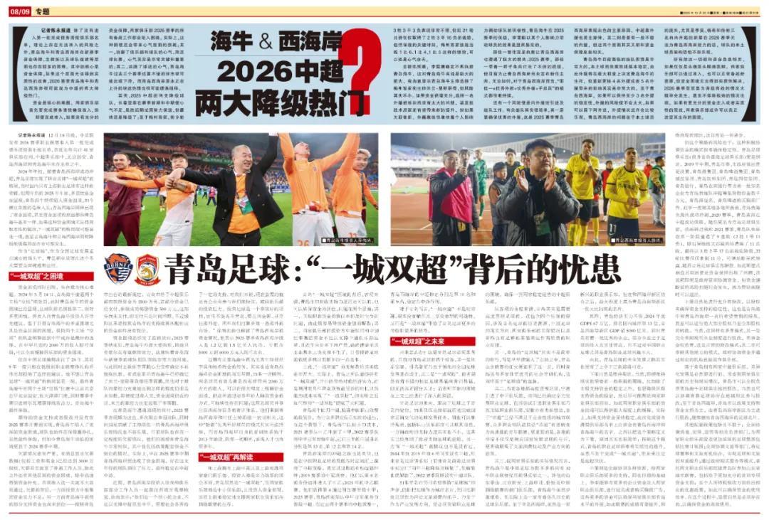 2024年年初,隨着青島西海岸成功衝超,青島足球實現了職業足球“一城雙超”的格局,當時國內只有上海職業足球有這樣的榮耀。但兩年後的2025年年底,多重憂患全面顯現:青島海牛持續陷入資金困境,如今橫亙在前的是准入關;青島西海岸同樣出現了資金困境,甚至資金困境的原因都和青島海牛基本一樣。如果這種資金困境無法得到根本性的解決,“一城雙超”的格局很可能曇花一現,甚至青島海牛和青島西海岸同時降級的極端局面亦有可能發生。