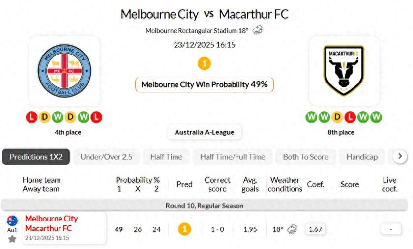 墨爾本城在A聯賽對陣麥克阿瑟FC的最近三場比賽中,進球數均不足2.5球