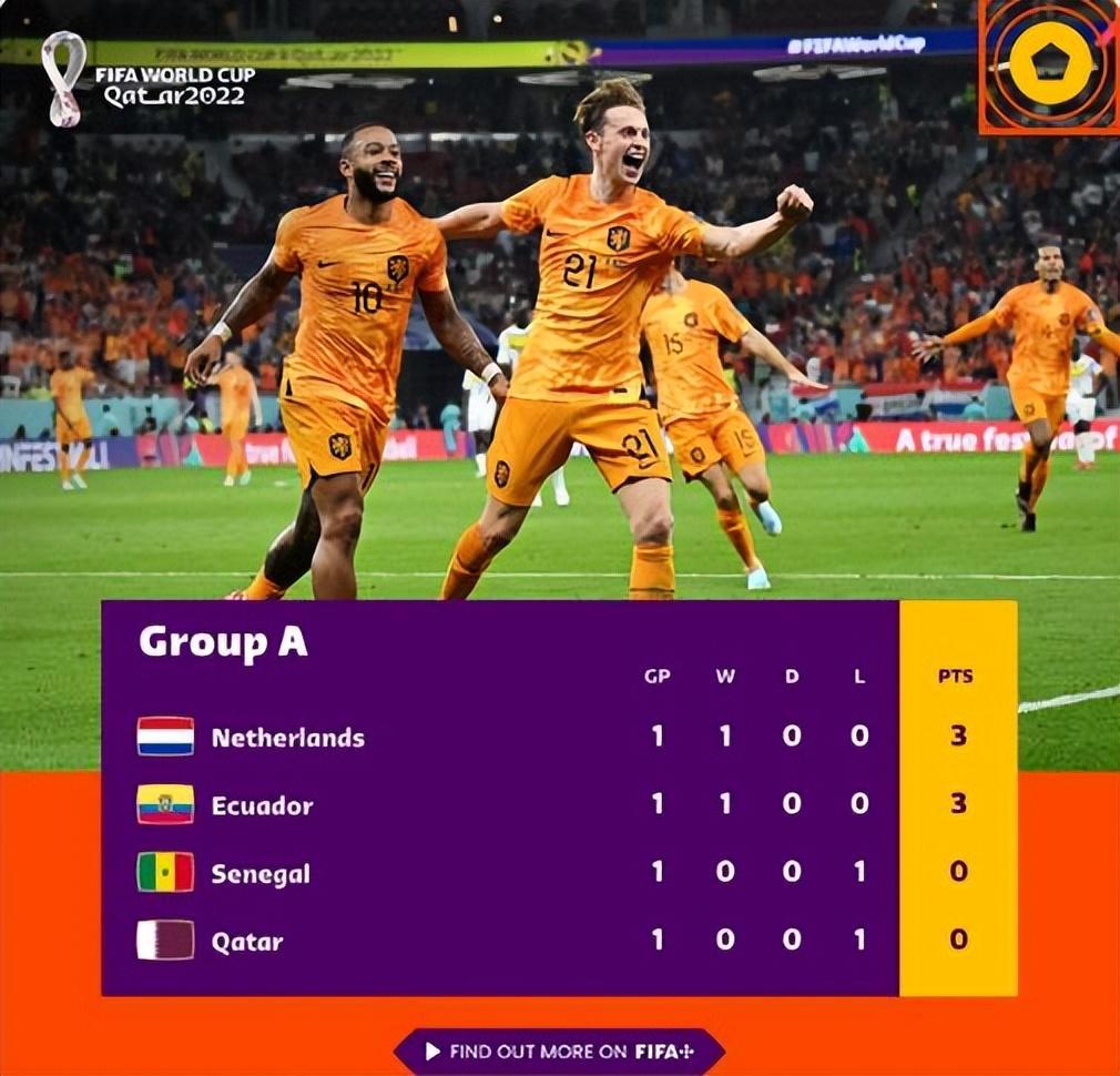 在昨天同組的另一場比賽,厄瓜多爾2-0戰勝東道主卡塔爾。本輪過後,荷蘭和厄瓜多爾並列小組第一。