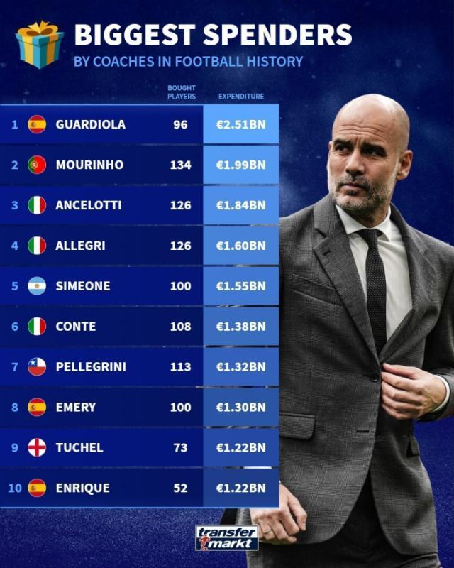 足壇歷史主帥引援花費排行:瓜帥25.1億歐領跑,穆帥19.9億歐第二