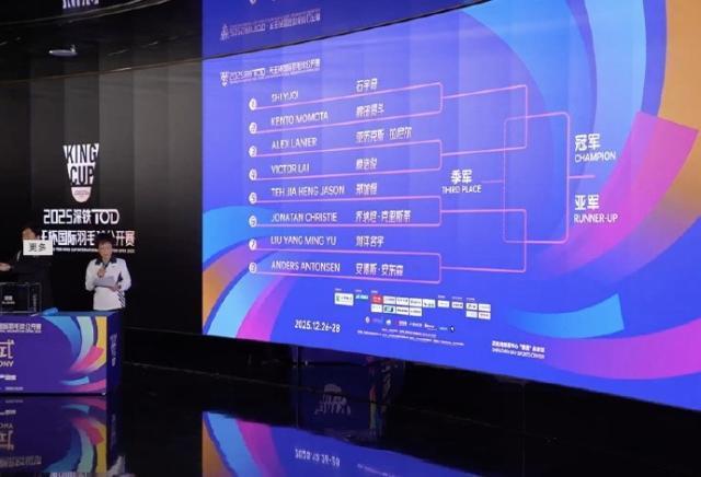 2025年天王杯抽籤結果出爐,石宇奇首輪對陣桃田賢鬥。2025年天王杯國際羽毛球公開賽將於12月26日-28日在深圳進行,共有8位球員參賽,上半區首輪對陣爲石宇奇vs桃田賢鬥、拉尼爾vs賴浩俊,下半區首輪對陣爲喬納坦vs鄭加恆、安東森vs劉洋名宇。天王杯總獎金300萬元,創羽毛球商業賽紀錄,冠軍120萬、亞軍60萬、季軍35萬、殿軍25萬,八強選手保底15萬元。