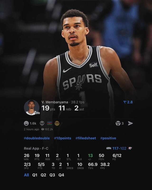 下半場比賽,當馬刺的手感終於開始冷卻時,他們又靠着堅實的防守繼續領跑。科內特和文班亞馬鎮守籃下,協作流暢的強側協防,頗具針對性地考驗雷霆角色球員的三分回應...當卡魯索終於在第三節投中了個人本場的第一個三分球時,雷霆得到的不是起勢,而是一種自我慰藉,因爲他們全隊第三節就投中一記三分,12中1。