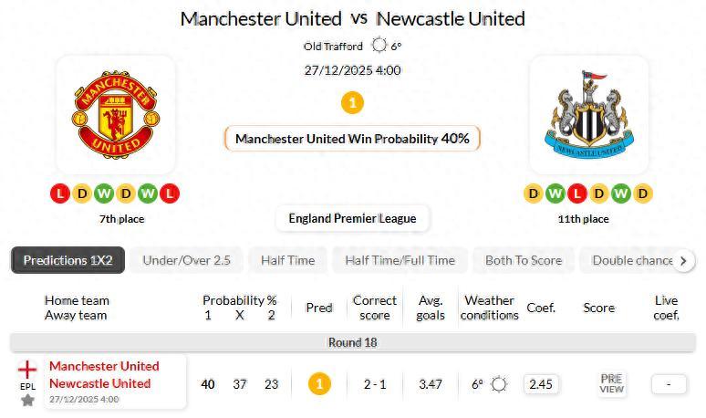 在各項賽事近26次主場對陣紐卡斯爾聯的交鋒中,曼聯有23場保持不敗。