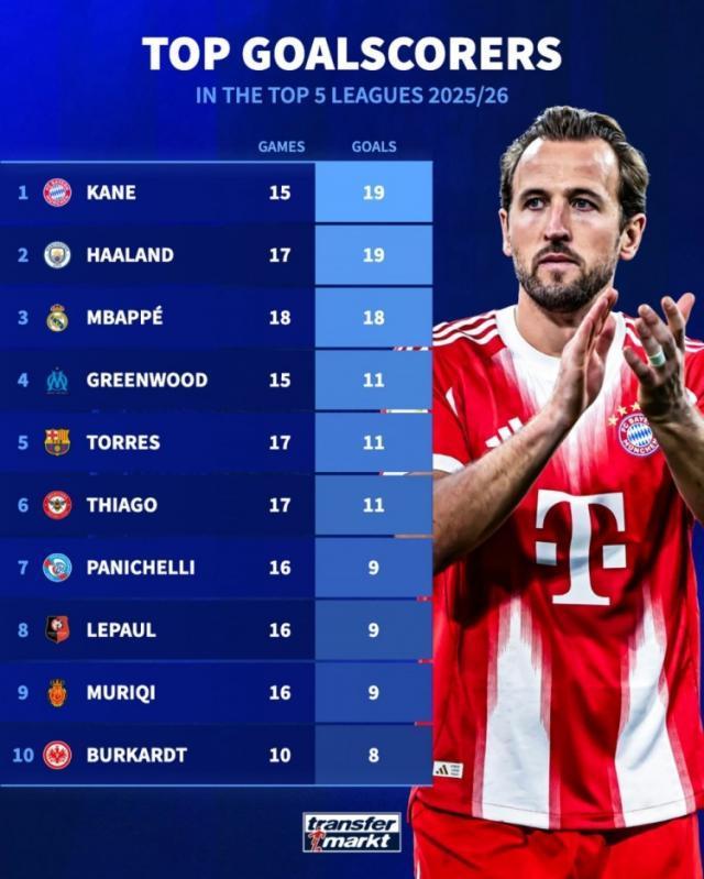 德國轉會市場列出了本賽季五大聯賽射手榜,凱恩、哈蘭德19球居首。本賽季五大聯賽射手榜: