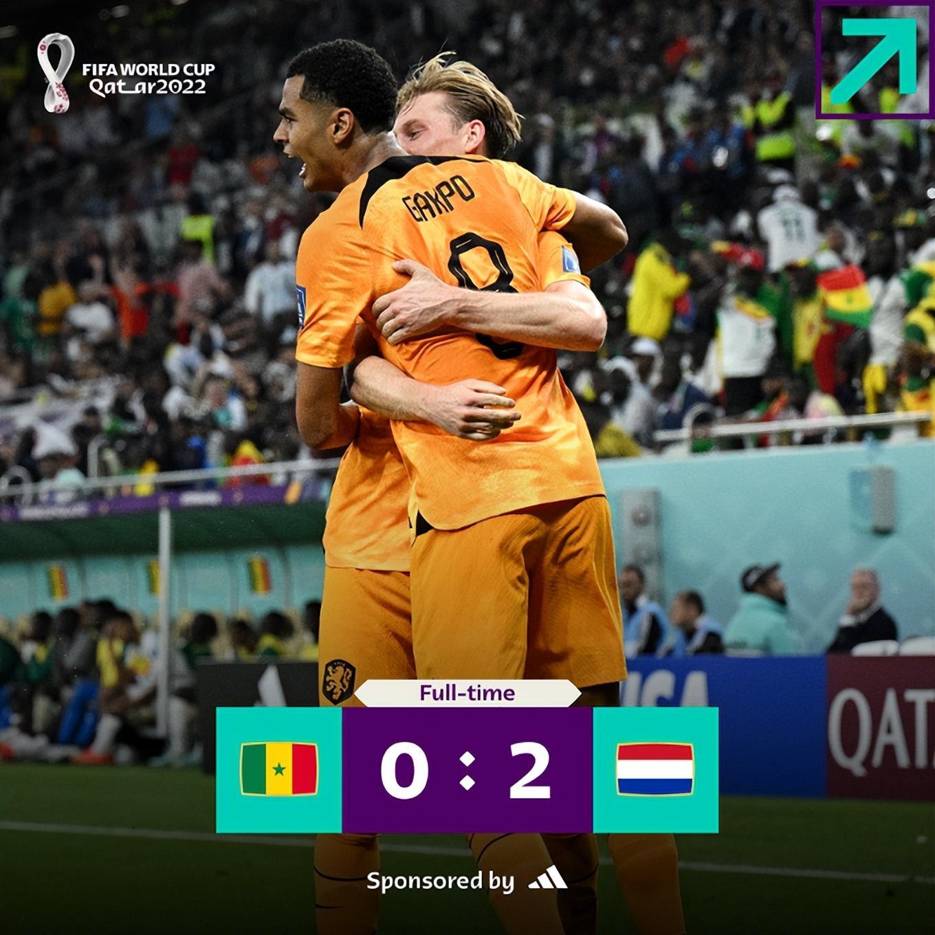 補時8分鐘,克拉森補射孟菲斯被門將撲出的射門鎖定勝局。雖然荷蘭隊被塞內加爾的英超3後腰緊逼難以實戰攻擊力,所幸運氣還是站在了範加爾一邊。沒有馬內的塞內加爾始終缺乏更有威脅的反擊,左後衛迪亞洛和後腰庫亞塔先後在下半場受傷,極大削弱了球隊防守能力,最終導致了哈克波的致命一擊。